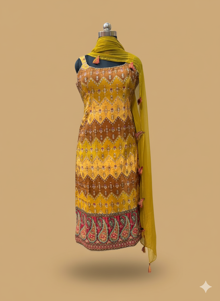 Mustard Printed Kurta Set with Embellished Detailing and Dupatta